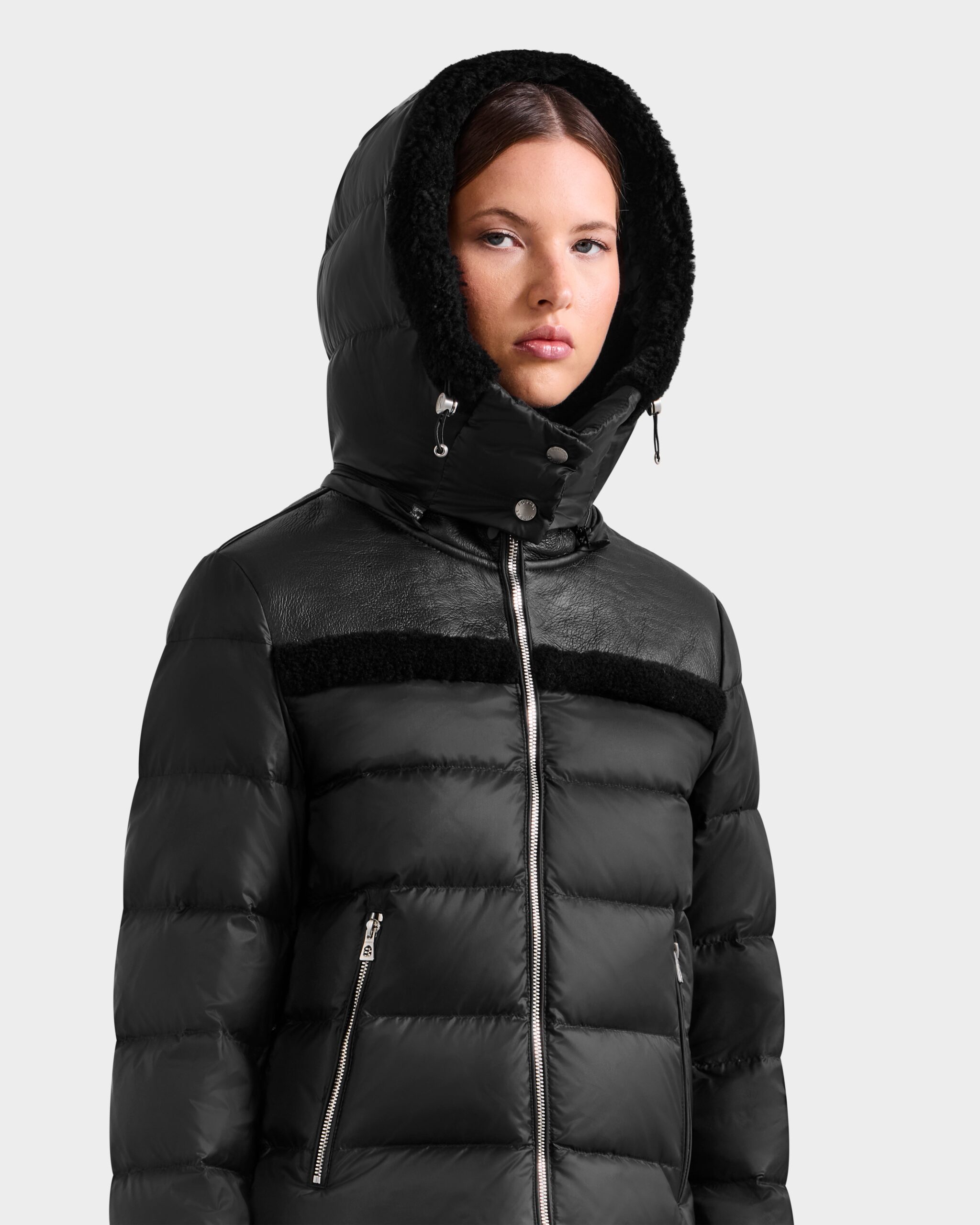 The SANDRA by RUDSAK is a women’s shearling combo puffer jacket designed to deliver elevated warmth with contemporary style. Crafted from plush shearling with a recycled nylon shell and lining, it offers lightweight insulation with responsibly sourced down and feather fill. The sleek, quilted silhouette is accented with soft shearling details for a refined, modern look. Perfect for cool days and city layering, SANDRA combines functionality and luxurious texture for confident, everyday wear.